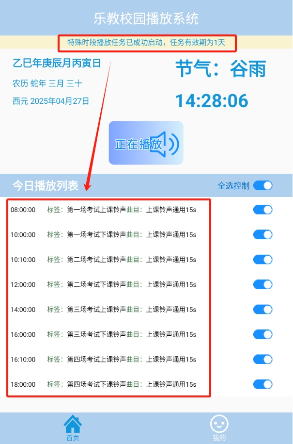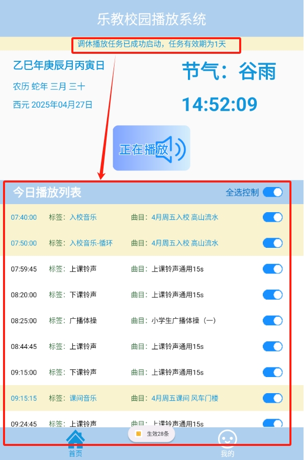 示例一:若20250427周日因节假日调整变成了工作日,系统则默认当天播放周二的打铃计划。