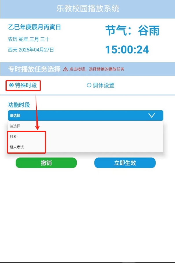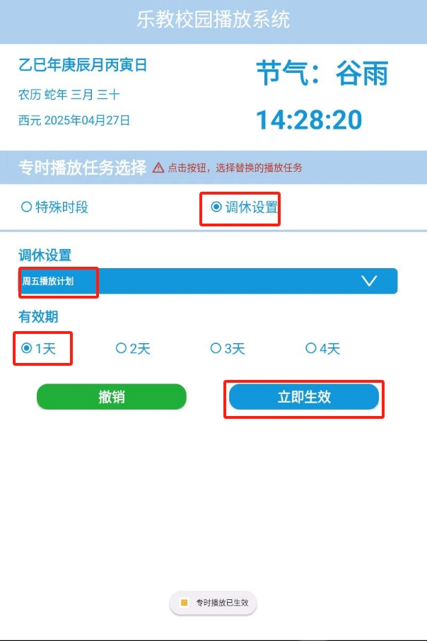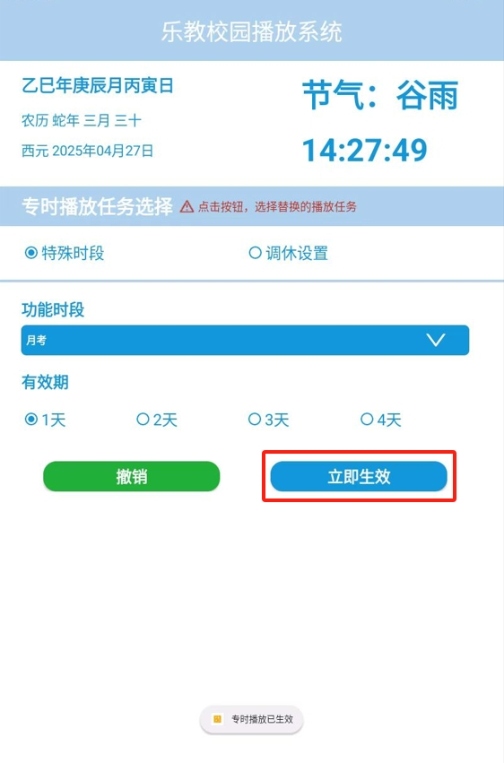 生效时间支持设置1~4天,点击【立即生效】,即为从当天开始生效,有效期X天。以以下数据为例,即为20250427日起生效“月考”的播报任务,有效期1天,20250428日当天会恢复为原有的定时播报任务。