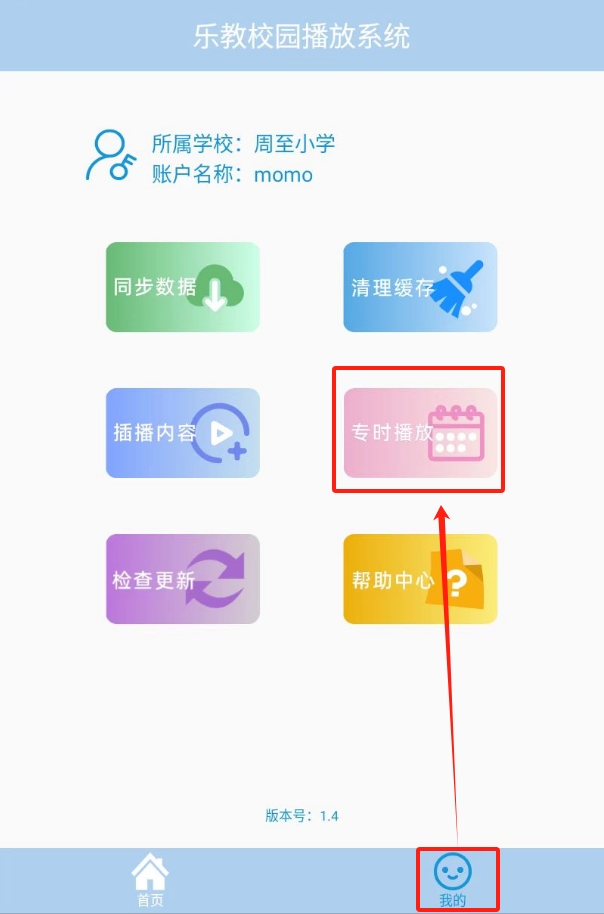 该模块可应用于短期调整的打铃计划(如:考试、法定节假日的调整),点击【我的-专时播放】可进入该页面,页面内的具体操作可参考以下操作指导。